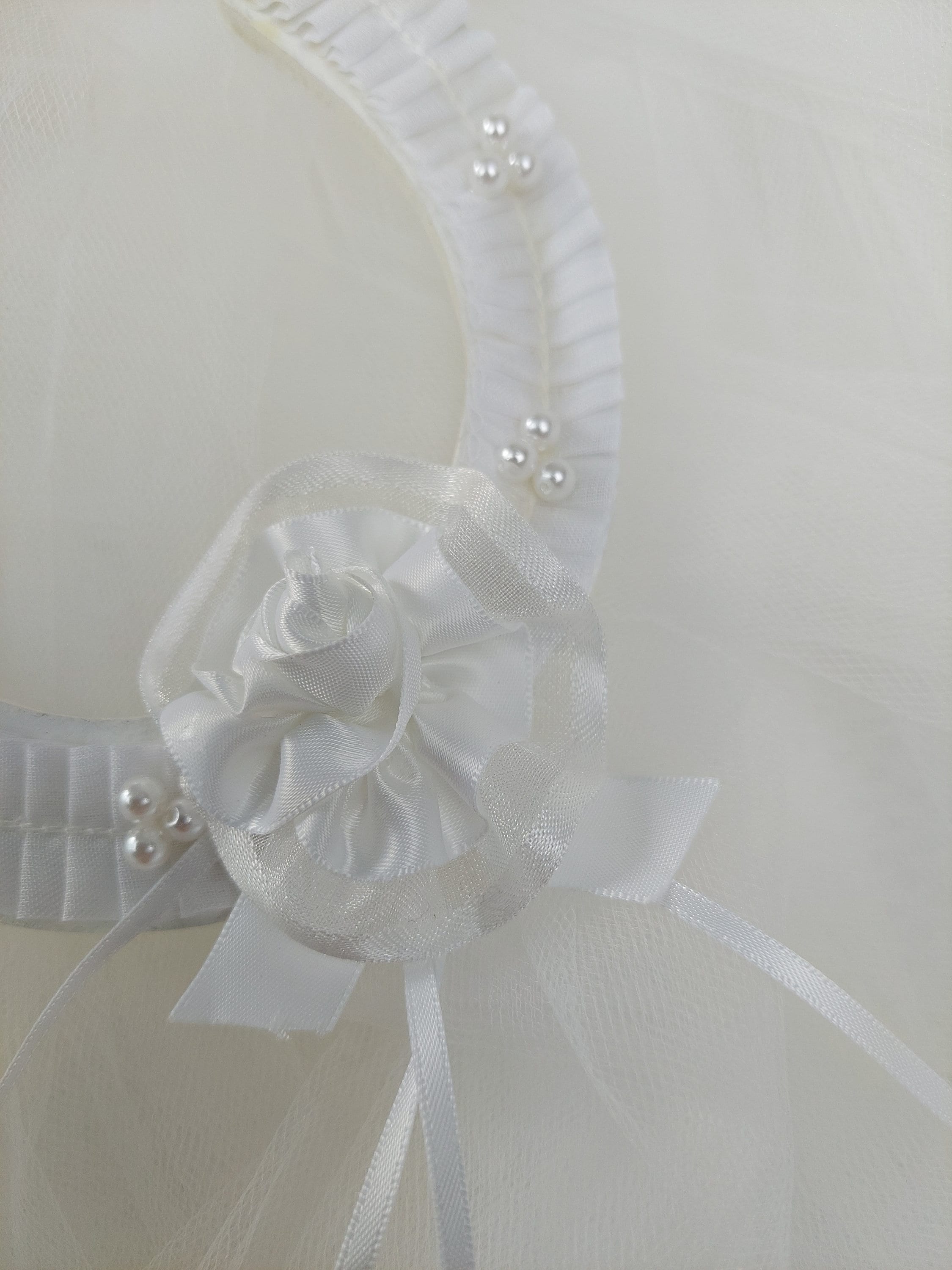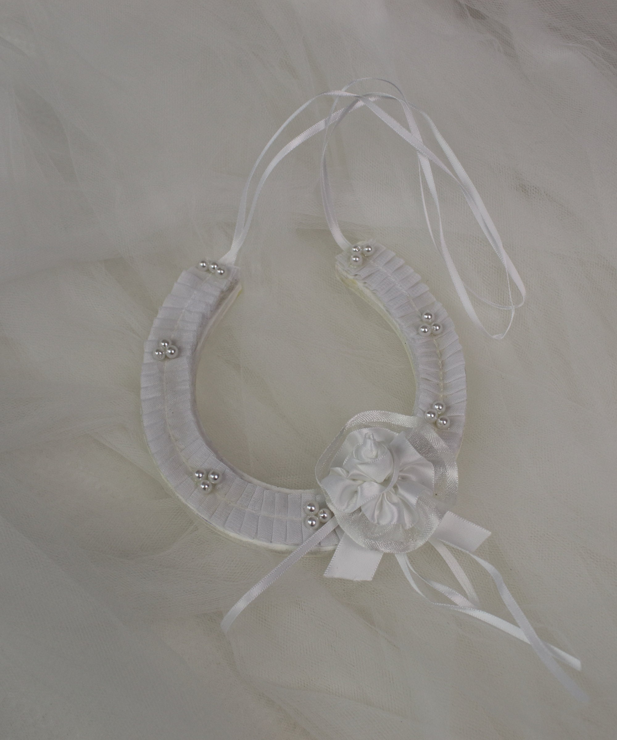 This beautiful white horseshoe, with pleated lace adorned with white pearl beads and a handcrafted satin flower and trailing satin ribbon is another traditional bridal horseshoe from our smaller pattern measuring 5" (13 cm) x 5.5" (14 cm). The white pleated lace makes this such a delicate vintage styled horseshoe charm with a modern wedding feel. Satin ribbon ties so it can be attached to the bride's bouquet.