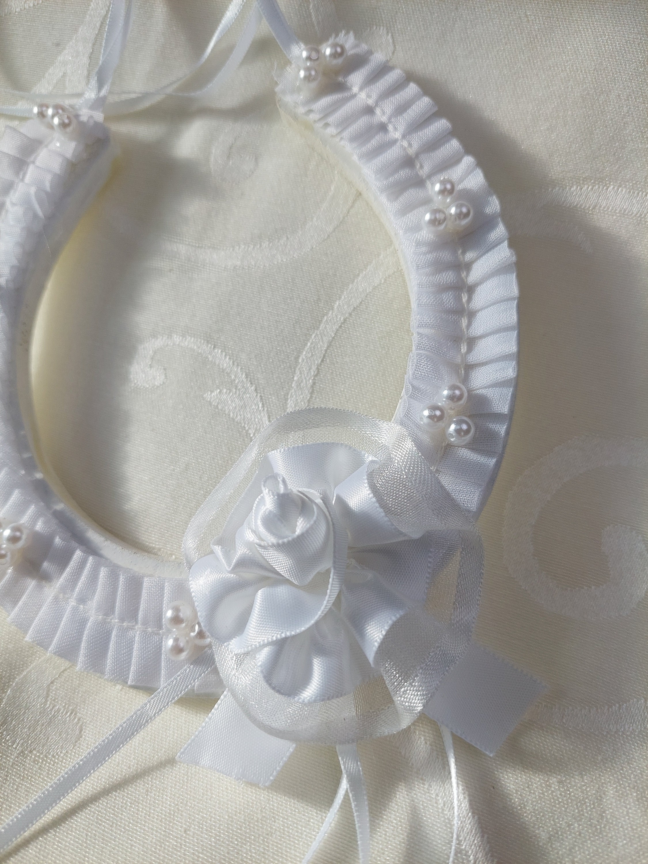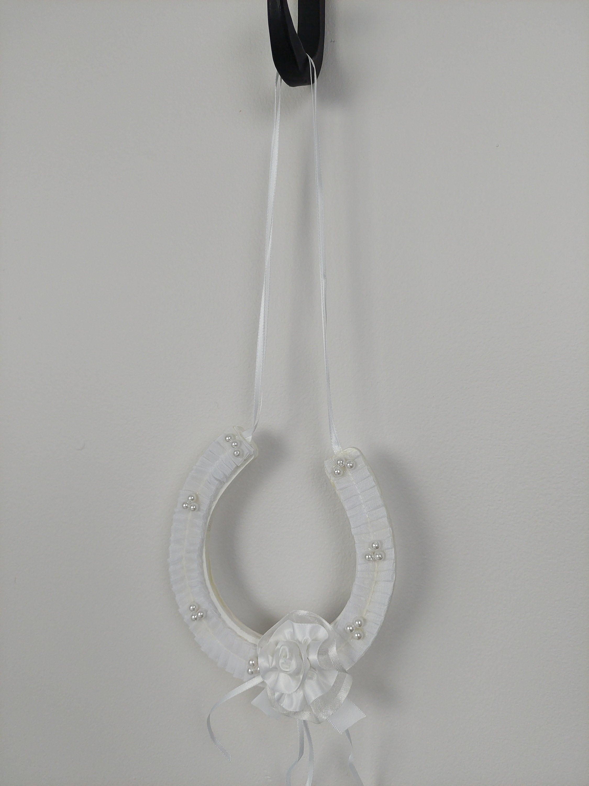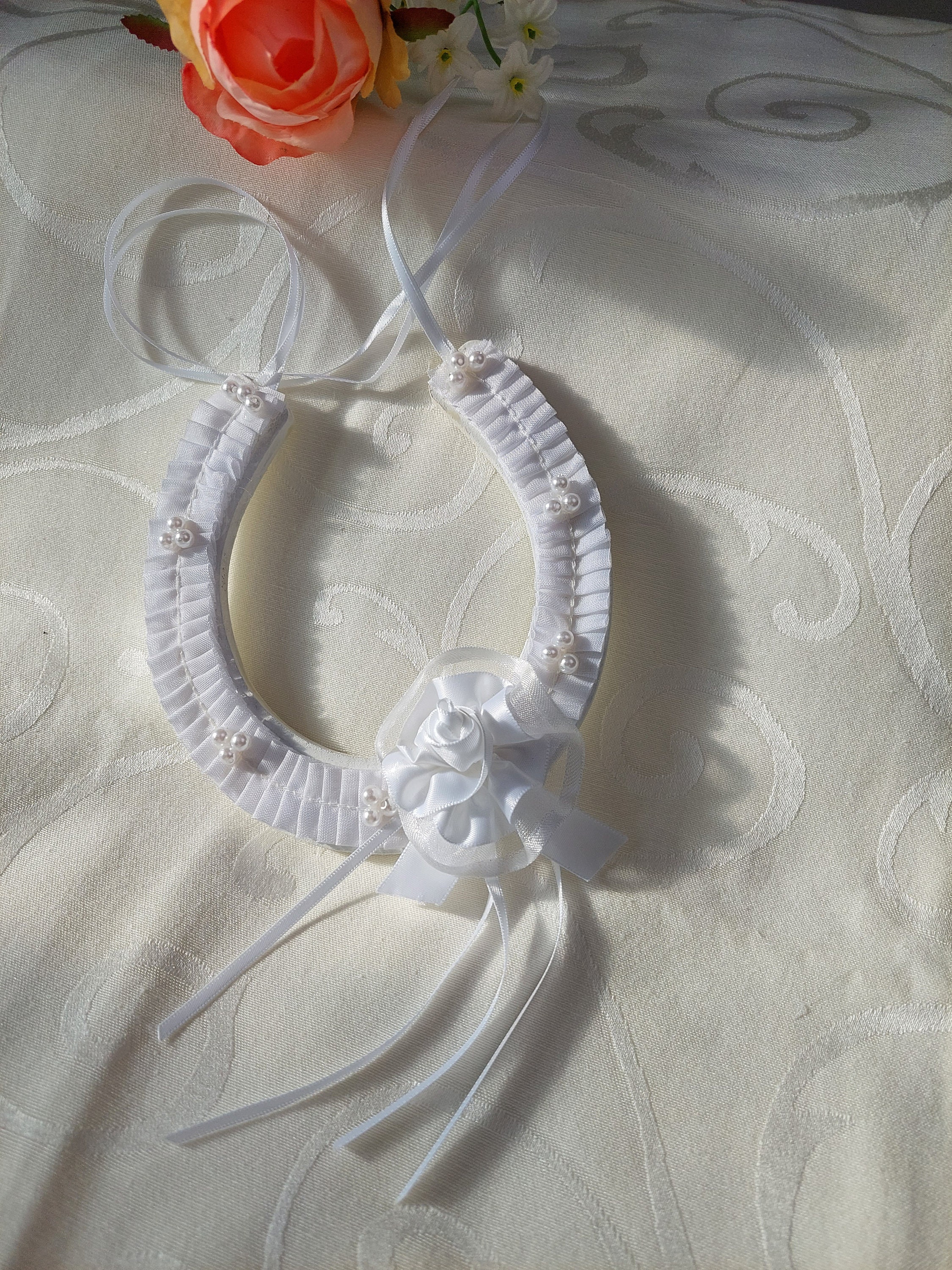 White Bridal Horseshoe for Bride, Wedding Blessing Horseshoe, Satin and Beads Bouquet Horseshoe, Bling Horseshoe, Good Luck Gift