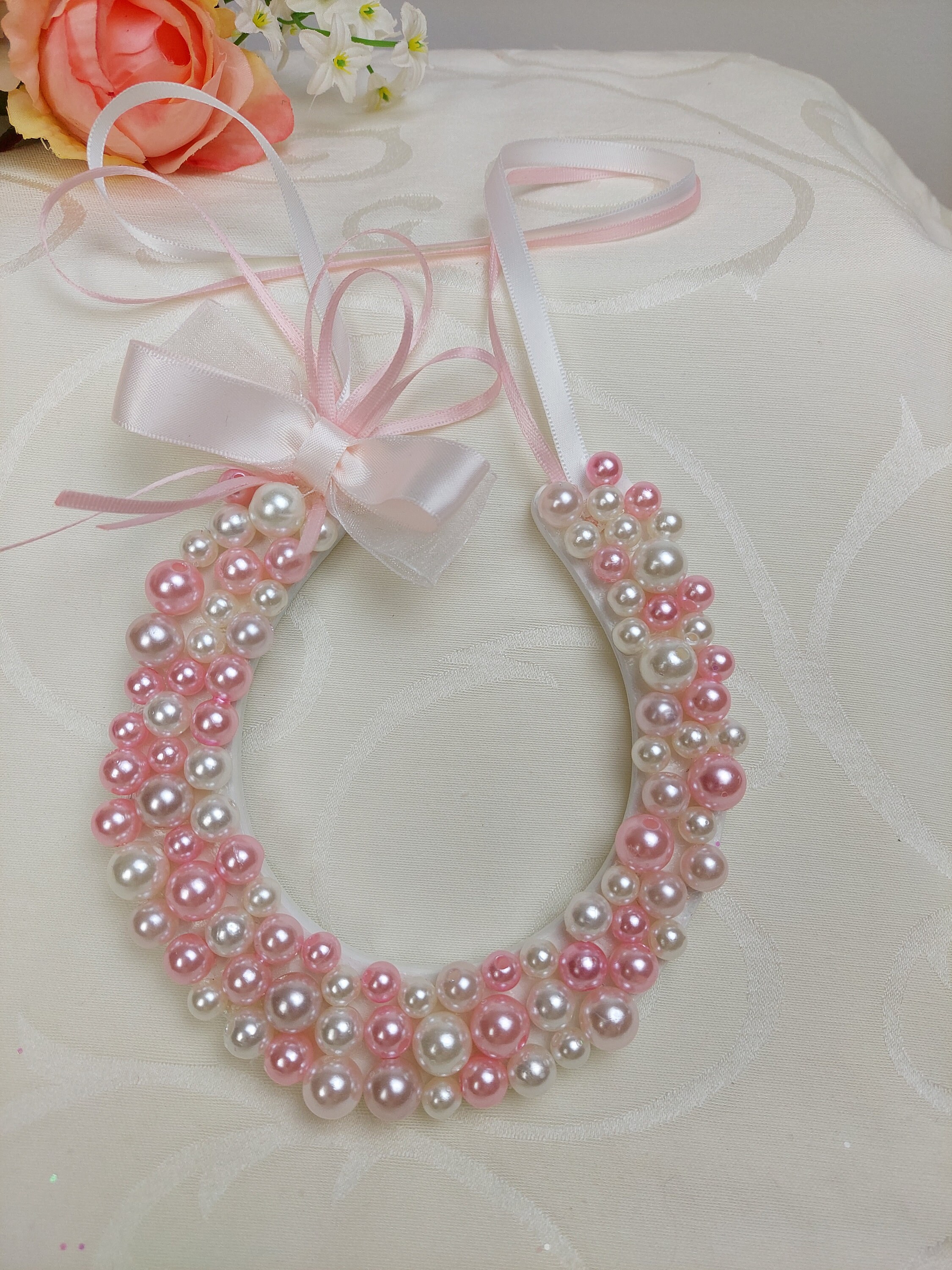 Beaded Bridal Horseshoe in pink and white for bride gift, Wedding Blessing Gift, Bridal Bouquet Horseshoe, Gift for Bride and Groom