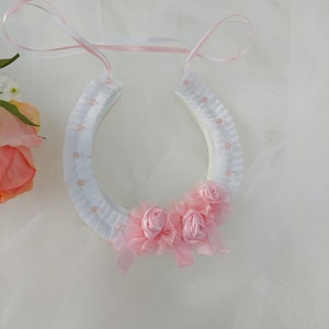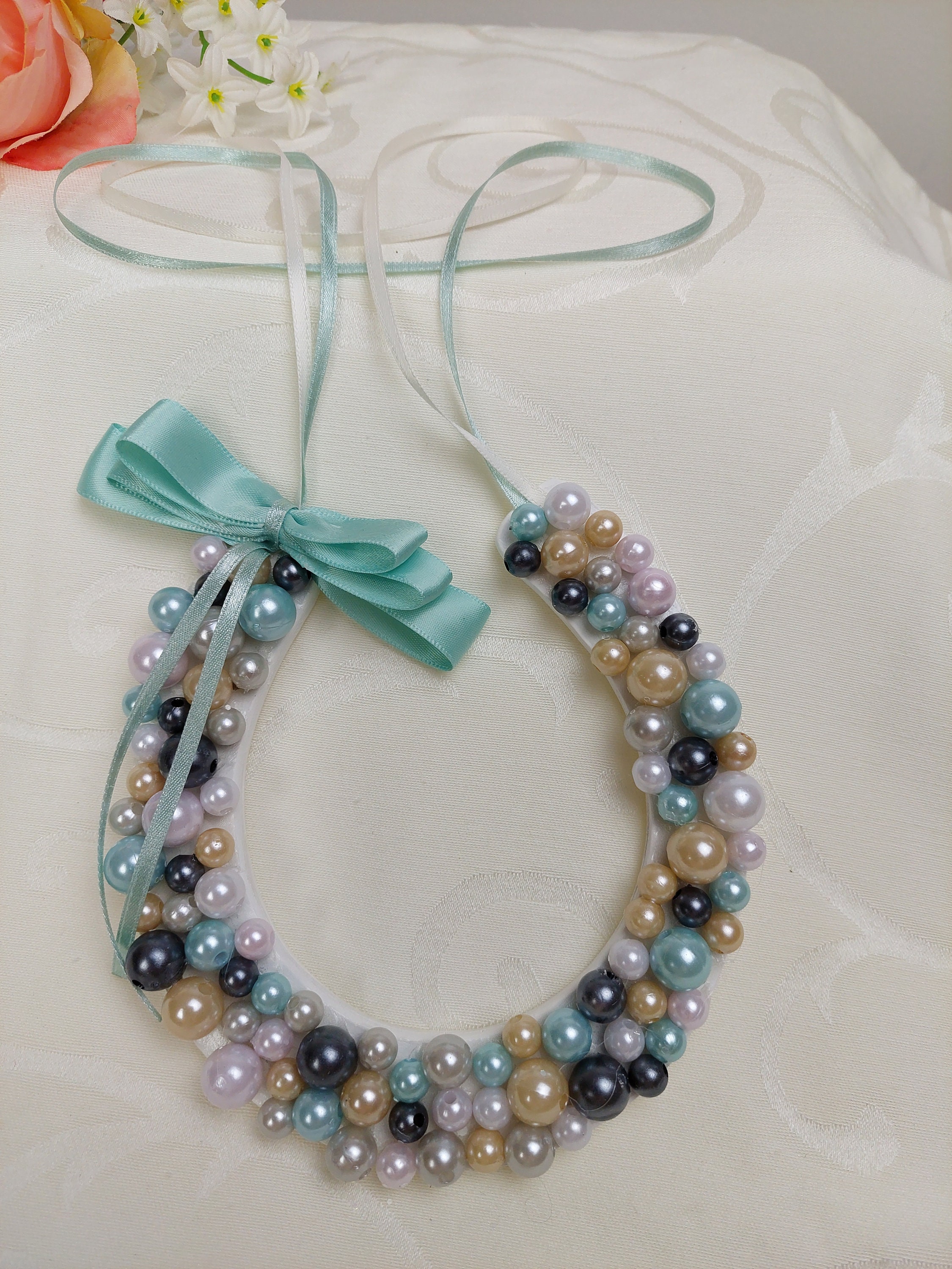 A beautifully beaded traditional bridal horseshoe from our smaller pattern measuring 5" (13 cm) x 5.5" (14 cm). Loaded with white, aqua, beige, charcoal silver beads and a white and aqua satin bow this vintage styled horseshoe charm has a modern wedding feel. There is a satin bow of the same aqua colour to add an elegant element. The satin ribbon ties to attach to the bride's bouquet.
