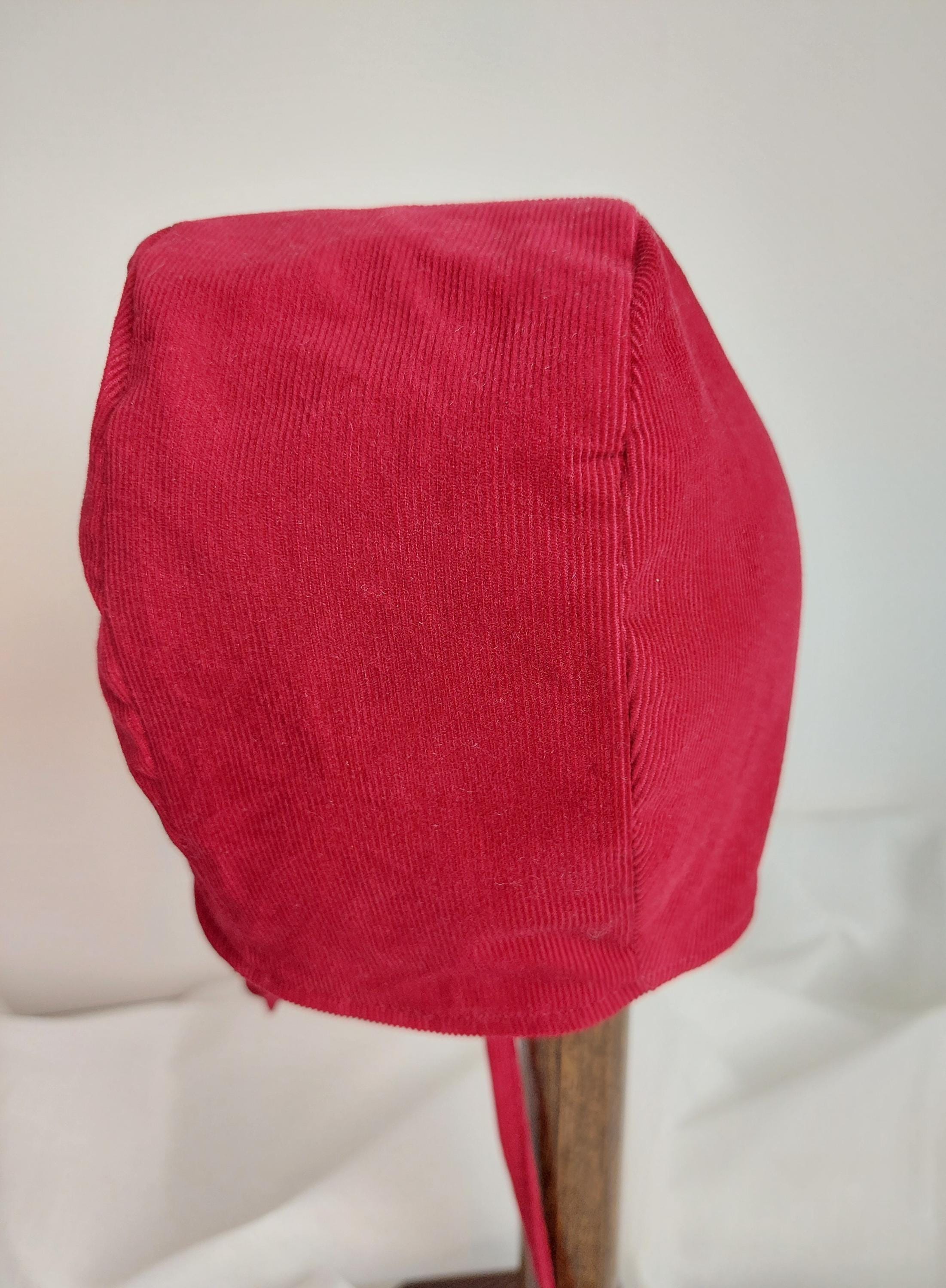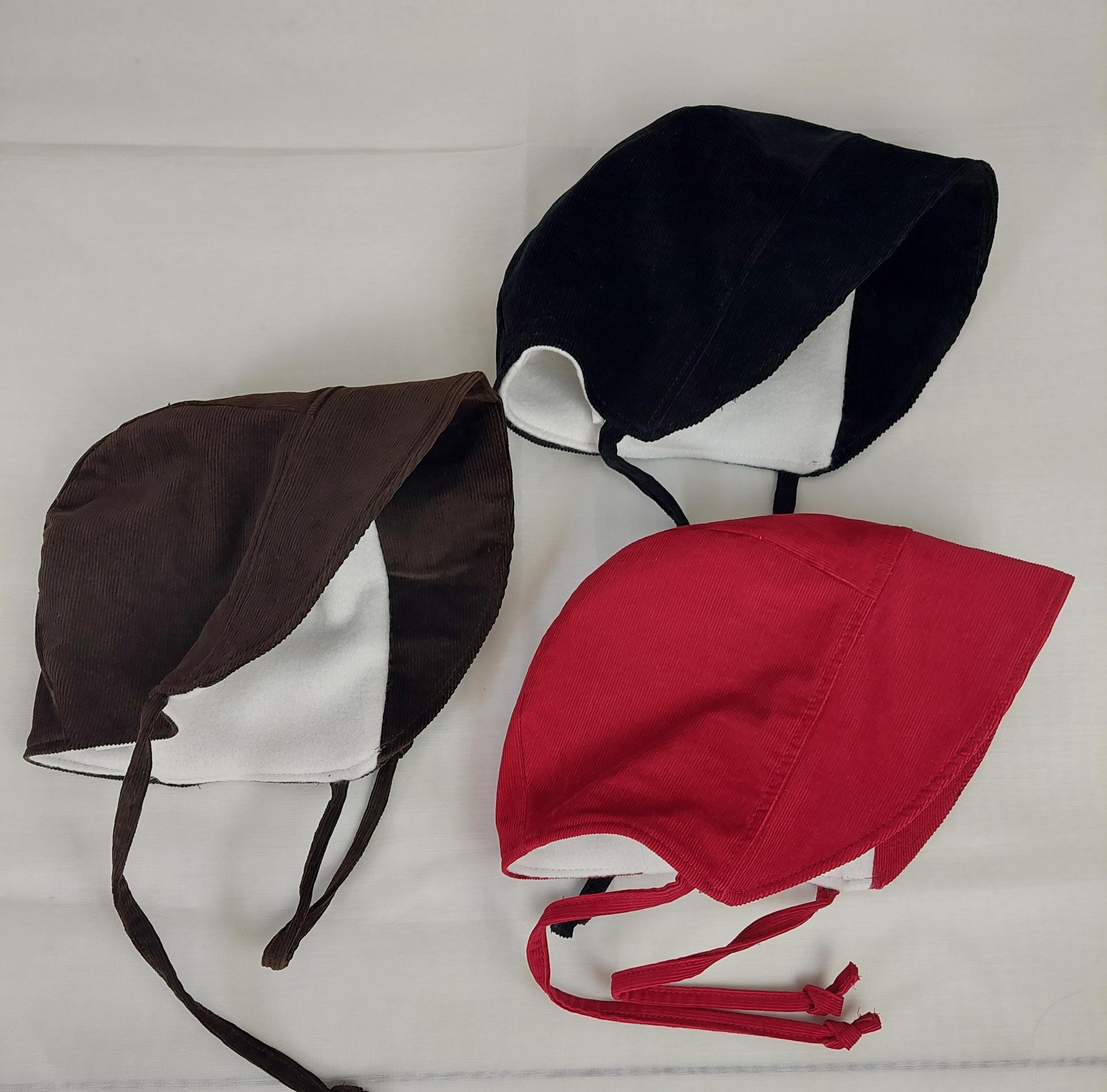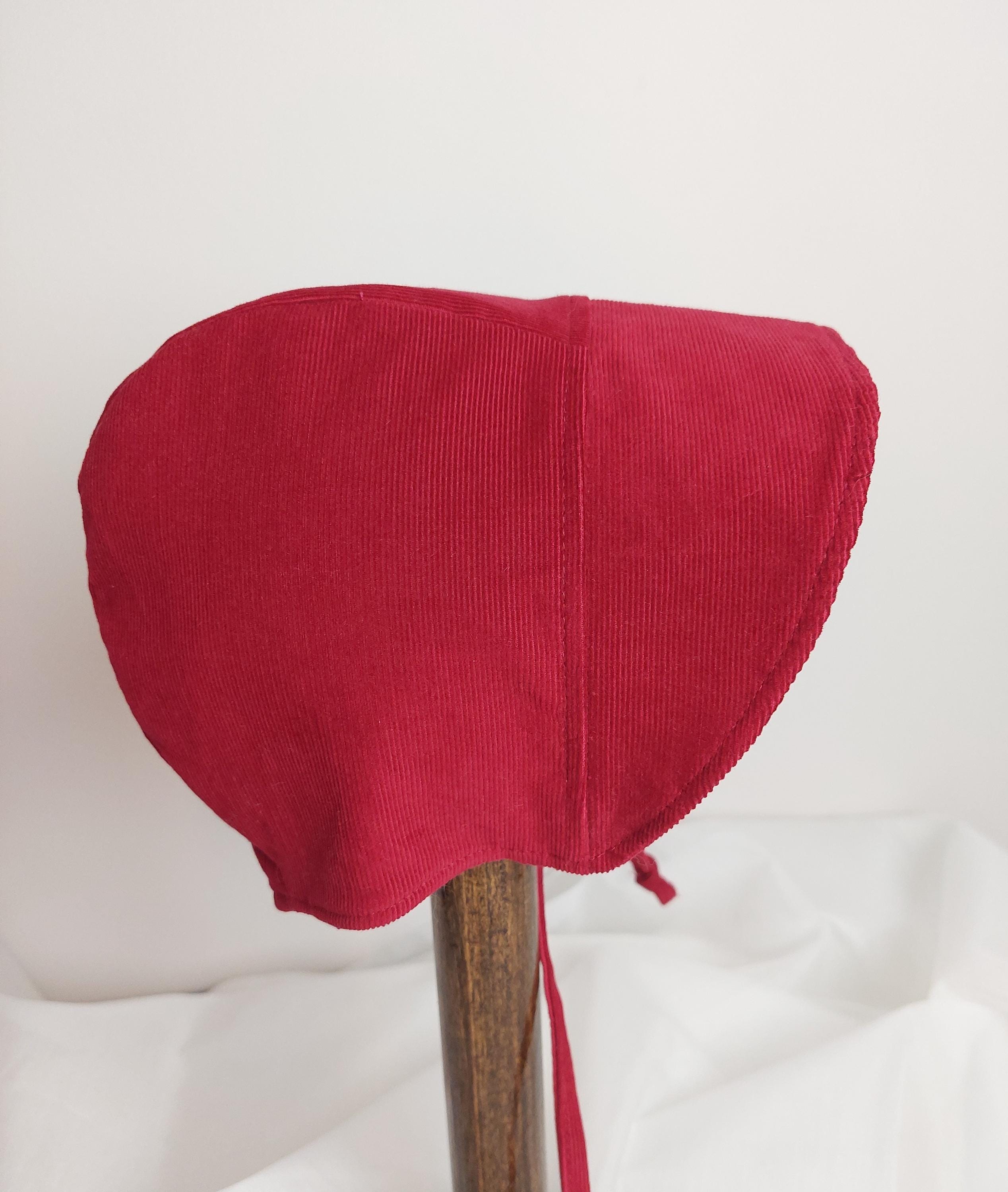 A very rich black, brown or red pinwale corduroy bonnet for a very pretty baby or toddler. This durable cotton hat will provide protection from the sun with its wide brim. It is lined with white bunting flannel providing softness against baby's delicate head and warmth making it suitable for Fall, Winter and Spring. The brim can be folded back if so desired. The colour and texture of this hat means it can be used for every day and special occasions. This bonnet will make a wonderful baby shower or birthday gift.