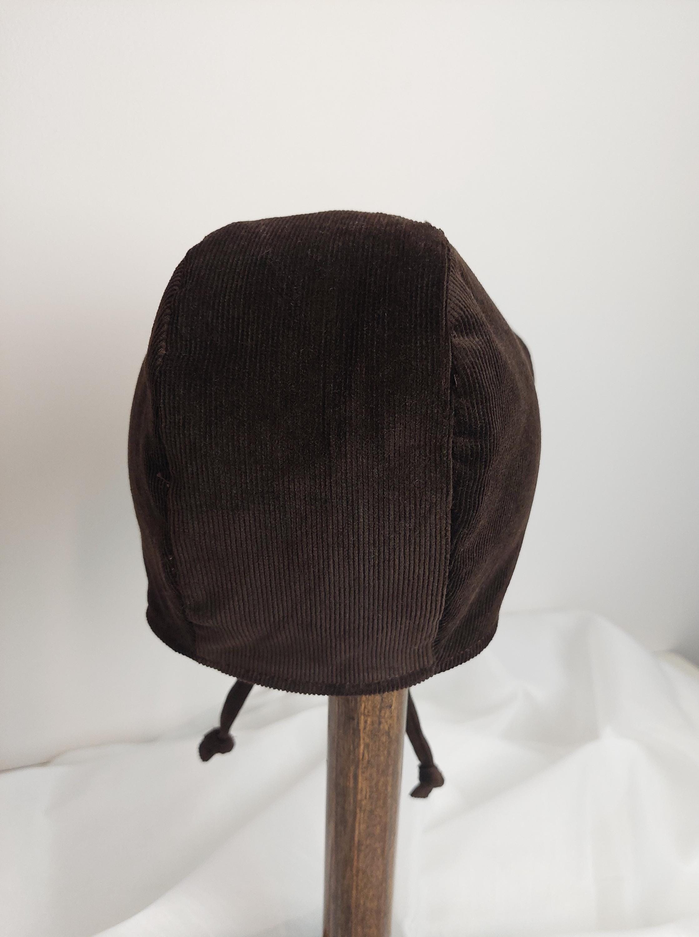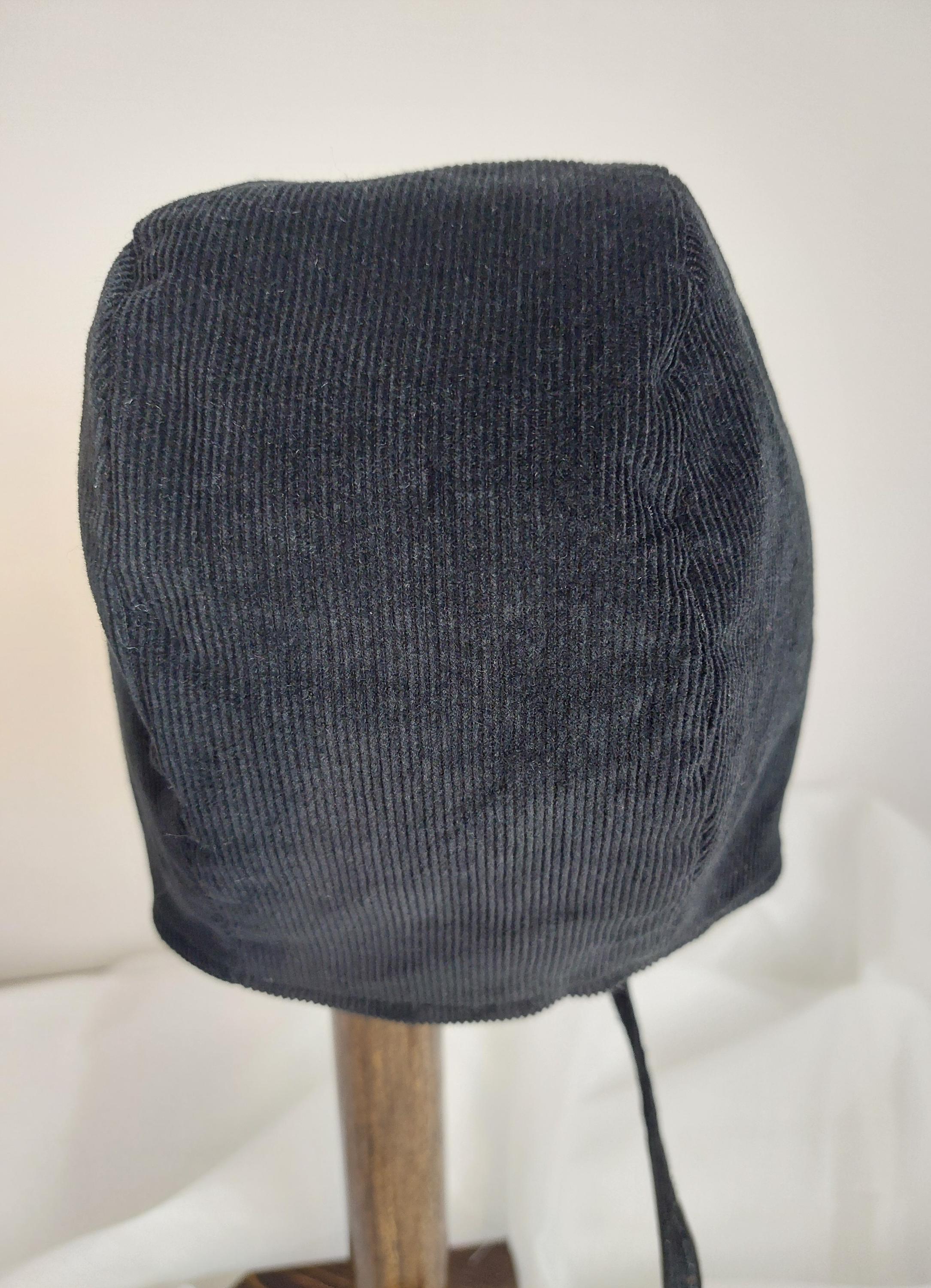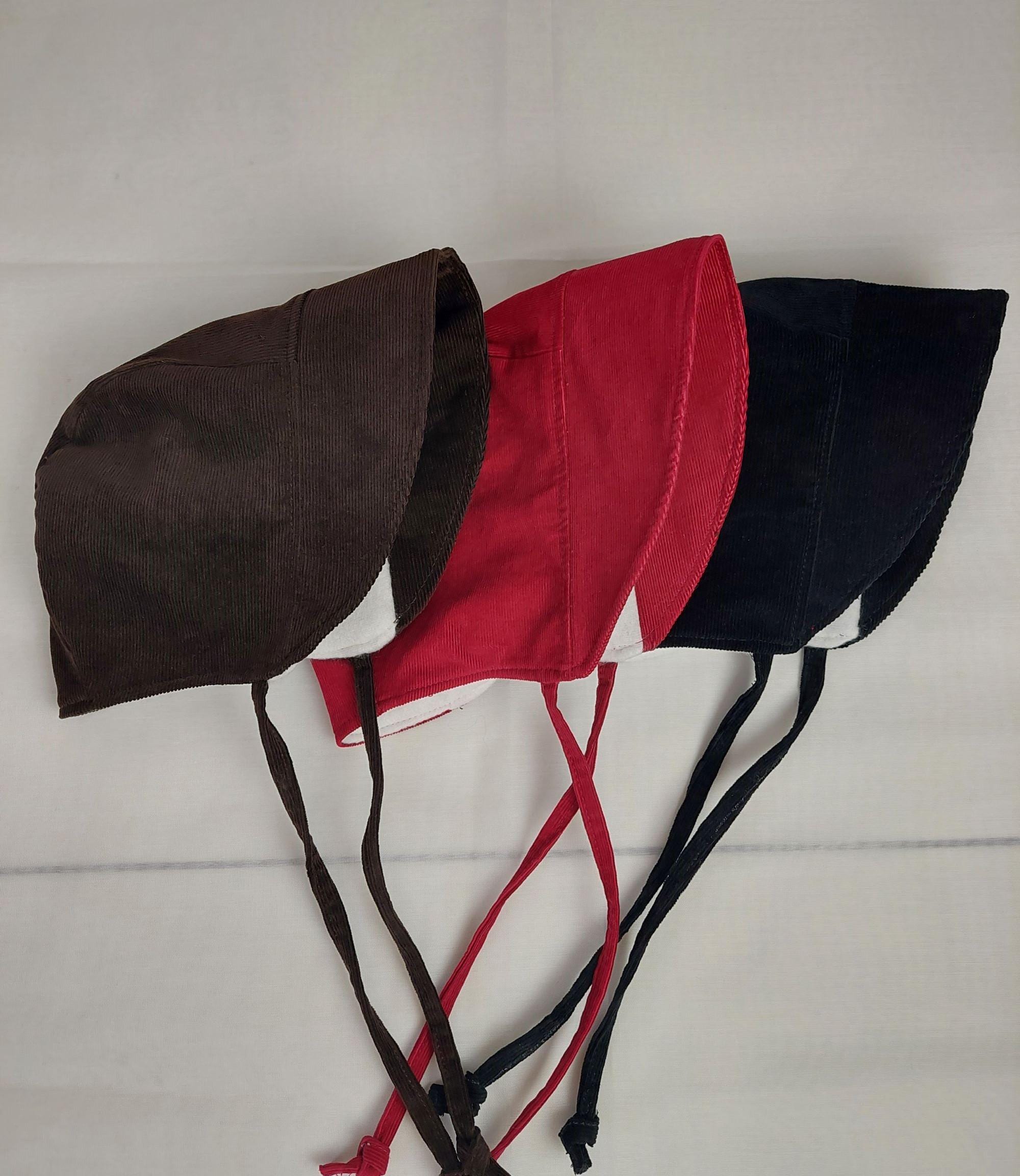 The outside fabric of the bonnet is durable corduroy and the brim is made of the same fabric and is interfaced to provide shape. The inside of the hat has white bunting flannel. The hat is secured with corduroy fabric ties.